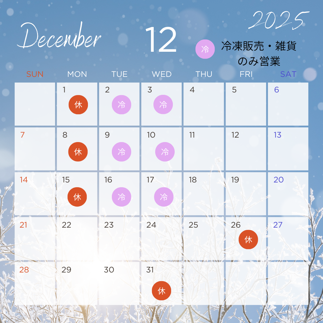 当店の12月の営業カレンダーになります!お越しの際はお気をつけてご来店ください。